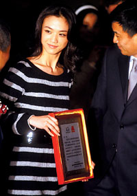 汤唯昨天打扮比较低调,一件黑白条纹的长毛衣,配上黑色的长靴,衬托出窈窕的身材。汤唯在红地毯上表现得十分亲切。不仅对欢呼的影迷微笑挥手,还满足了部分影迷握手和签名的要求。面对媒体,汤唯也表现得十分亲切。尽管工作人员一再催促她尽快入场,但她还是在媒体的要求下简单地回答了两个问题。汤唯称自己拿到金马最佳新人奖很开心,能出席晚宴,为慈善事业出力也很快乐。