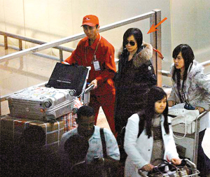 刘嘉玲(箭头处)抵达上海机场