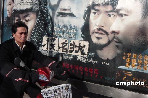 12月6日,行人从北京街头电影《投名状》海报旁走过。倍受瞩目的华语大片《投名状》成为07年度最具期待的大片之一,这部被评价为“让男人感动”的电影,同时也汇聚了华语影坛的一流男演员:刘德华、李连杰、金城武、郭晓冬。6日晚,这部年度重头电影《投名状》于北京首映。 中新社发 吴芒子 摄