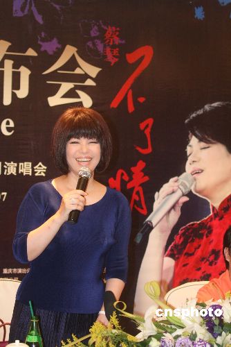 9月27日,台湾著名歌星蔡琴亮相重庆与媒体及歌迷见面。蔡琴在见面会上透露,“我是那种很喜欢温暖音乐女人”。据悉,本月29日,蔡琴将在重庆大田湾体育馆举行演唱会。图为蔡琴在见面会现场。 中新社发 陈杰 摄