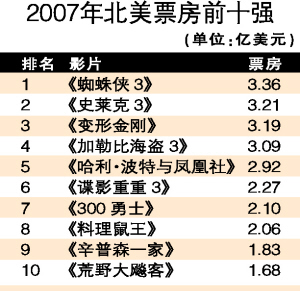 尚有数天便告别2007年,是时候为好莱坞电影发一张票房成绩表。今年,《蜘蛛侠3》以3.36亿美元(约合25亿人民币)成为北美最卖座电影。综观今年电影票房,仍然是特技片与动画片的天下,由香港动画师许诚毅执导《史莱克3》领跑动画片,以3.21亿美元排名第二。 华人演员参演的成绩则好坏参半,周润发及成龙分别凭《加勒比海盗3》及《尖峰时刻3》排第4及13位,成绩最好;而去年成功进身好莱坞的Maggie Q,与布鲁斯·威利斯合作的《虎胆龙威4》亦紧随《尖峰时刻3》片排14位;可是另一套她有份参演的《愤怒乒乓球》仅排72位,而刘玉玲主演的《清除代码》更惨排前150位的倒数第6位,而亚洲大收旺场的《色,戒》在票房榜前150位无影无踪。 |