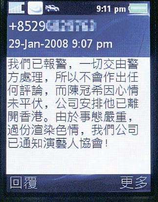 据了解,部分裸照可能源于一部已遗失或曾交予他人修理的手提电脑,不过,事件关键人物陈冠希,其经理人29日通过手机短讯回应传媒时指出,由于陈冠希心情未平复,公司安排他离开香港。