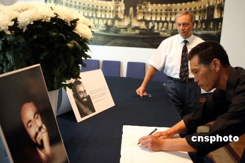 资料图:九月十日,意大利驻华大使馆设置帕瓦罗蒂吊唁大堂,供北京市民以及各界人士前去缅怀吊唁这位高音C之王。吊唁大堂自当日上午十一时正式接待来自各界的人士。中新社发 任海霞 摄