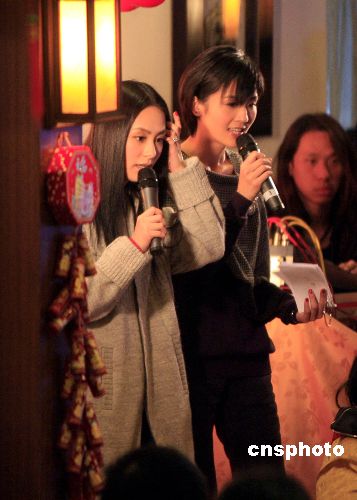 涉及疑似艺人淫照风波的香港歌手钟欣桐(阿娇)(左),二月十一日下午到香港英皇中心与歌迷进行新春聚会,并会晤传媒,为裸照风波宣读声明,但期间不接受记者提问。钟欣桐在露面时承认,以前很天真及傻,对事件的社会影响深感抱歉。感谢歌迷及同事对她的关心。 中新社发 王丽南 摄