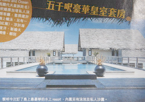 新近出版的香港两家著名周刊透露,黎明和乐基儿在马尔代夫的“洞房”十分奢华,是该岛上水上豪华套房,面积达1600多平米,日租近四万港币,拥有两间巨型豪华睡房,房外的花园有大型水池和露台,酒店还代安排四人沙滩晚宴,该房内的设计更是极具浪漫氛围。据这两家周刊透露,在2007年10月,黎明还斥资6000万买下上水双鱼河独立豪宅St.Andrews Place,刚好可以作为新房之用。 |