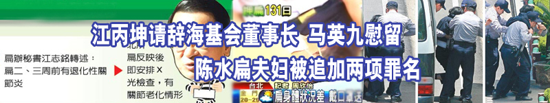 陈水扁羁押抗告被驳回 将在看守所过春节 陈水扁狱中忙出书 做皇帝梦遭各界讥讽 吴淑珍部分认罪并道歉 扁办征文赛奖品竟是探监 吴淑珍曝企业献金13亿 陈镇慧全部认罪对扁珍不利 台北法院连审扁家弊案 扁绝食闹剧草草收场 台海基会成立18周年 民众认为两岸交流速度适中 台湾“319枪击案”满5年 检方重启调查 扁“劲辣”新书引绿营内讧 扁子投书媒体惹众怒 民进党台南县长提名惹争议 扁辜对质激烈 台特侦组改组续办扁案 台渔船遭海盗挟持 马英九称两岸交流议题多 台民众期待陈江会 台各界肯定陈江会成果 中华台北获邀WHA |