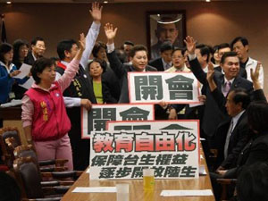 台湾“立法院内政委员会”4日排定审议攸关大陆学历认证以及大陆学生来台求学的条例相关条文修正草案,民进党“立委”上午霸占主席台后,下午又上演反锁“立法院”会议室大门闹剧,导致议事停摆。国民党“立委”在大门贴上海报,指责民进党锁人锁己。