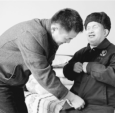 黄辉(左)在为患有眼疾的彭永富老人穿衣。