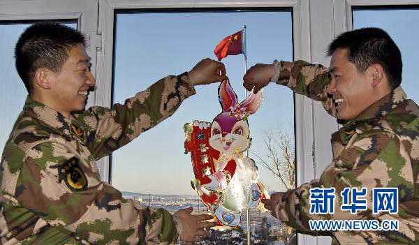 2月2日清晨,国门中队的干部在营房内贴兔年吉祥物。驻守在我国北疆中俄边境线上的满洲里边防检查站国门中队的干部战士们大年三十开始贴对联煮饺子迎接新年。满洲里口岸是我国最大的陆地口岸,年过货量超过2000万吨。新华社记者李欣摄