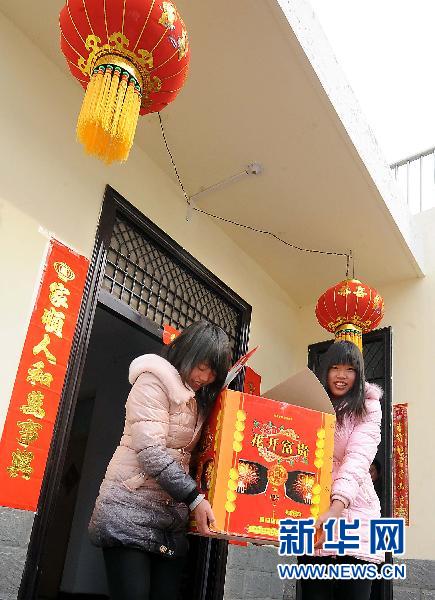2月3日上午,在新李营村的一户村民家中,两位女孩抬着一箱烟花准备送给相邻的亲戚。当日是农历新年的大年初一,记者来到位于河南省新郑市郭集镇的新李营村。这个村是一个南水北调移民新村。2010年8月21日,因国家南水北调工程的实施,原来住在河南省淅川县上集乡李营村的205户村民,千里迢迢搬到这里安家落户。今年是村民搬入新居后过的第一个春节。在村内,记者看到一排排二层小楼墙洁窗净,家家户户门上都贴着春联、“福”字,挂着大红灯笼。街外屋内,男女老幼走亲戚、放爆竹、看电视、做年饭,处处洋溢着其乐融融、生机勃勃的和谐氛围。新华社记者王颂摄