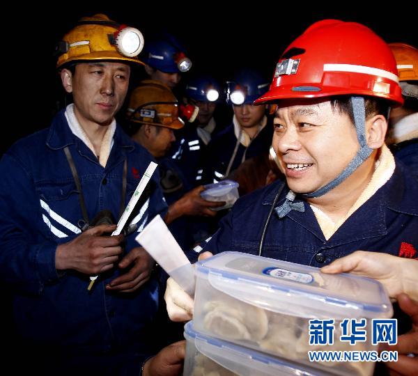 2月2日,山东兖矿集团董事长王信(右)在济宁三号井煤矿为大年三十仍坚持在一线工作的煤矿职工送饺子。当日,山东兖矿集团领导班子走入基层,看望和慰问奋战在一线的煤矿职工。 新华社记者陈建力摄
