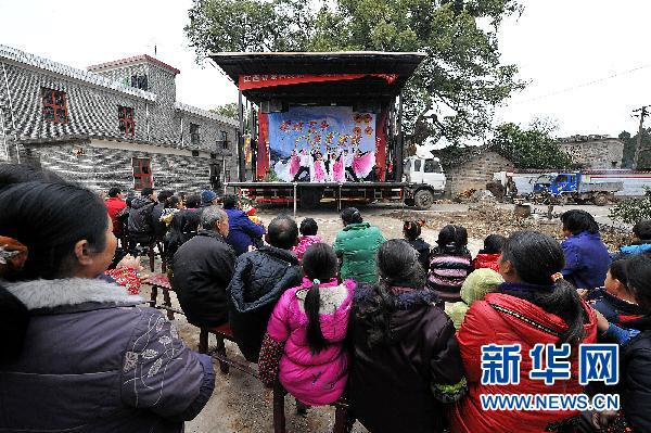 2月14日,江西省泰和县南圳村村民在家门口看演出。当日,为迎接元宵节,江西省泰和县采茶剧团的演员为乡亲们送上了一场具有地方特色的采茶舞戏。 新华社记者 何俊昌 摄