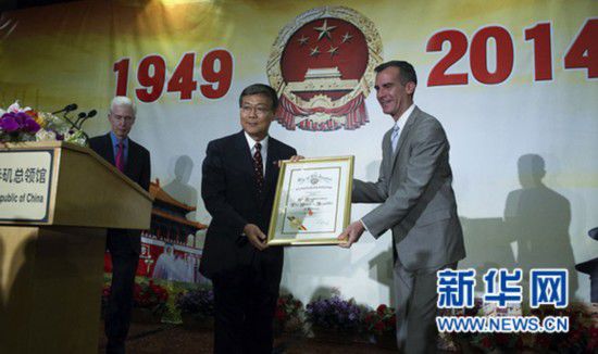 9月25日,中华人民共和国驻洛杉矶总领馆在洛杉矶举行盛大招待会,庆祝中华人民共和国成立65周年。洛杉矶市市长埃里克·加希提、美国国会议员赵美心等各界嘉宾500余人出席了招待会。