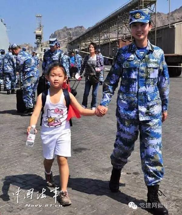 2015年3月29日,临沂舰抵达也门亚丁港,女舰员带领撤离的儿童登舰。