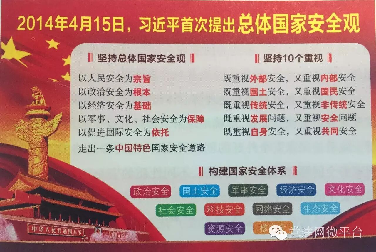 五大要素:以人民安全为宗旨,以政治安全为根本,以经济安全为基础,以军事、文化、社会安全为保障,以促进国际安全为依托,走出一条中国特色国家安全道路。