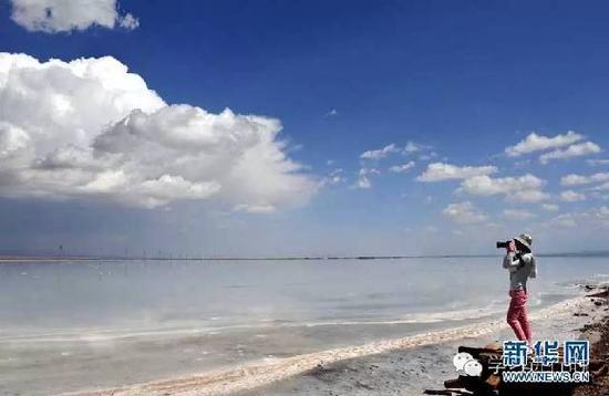 游客在茶卡盐湖岸边拍摄盐湖风光。位于青海省柴达木盆地东部乌兰县的茶卡盐湖,与塔尔寺、青海湖、孟达天池并称为“青海四大景”。新华社记者王颂摄