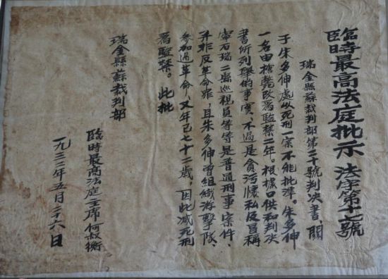 图为临时最高法庭关于朱多伸案的批示。瑞金市人民法院 邓逸楠供图
