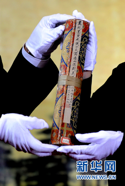 5月11日,工作人员在启运仪式上展示《富春山居图》(剩山图)。 当日,浙江省博物馆的“镇馆之宝”《富春山居图》前半段(剩山图)赴台启运仪式隆重举行。《富春山居图》(剩山图)在浙江省博物馆点交启运,将经由北京后赴台,于6月1日在“山水合壁——黄公望与《富春山居图》特展”上,与台北故宫博物院所藏《富春山居图》(无用师卷)联合展出。这将是该画作两部分在分别360年后首次实现合璧。 新华社发(梁臻 摄)