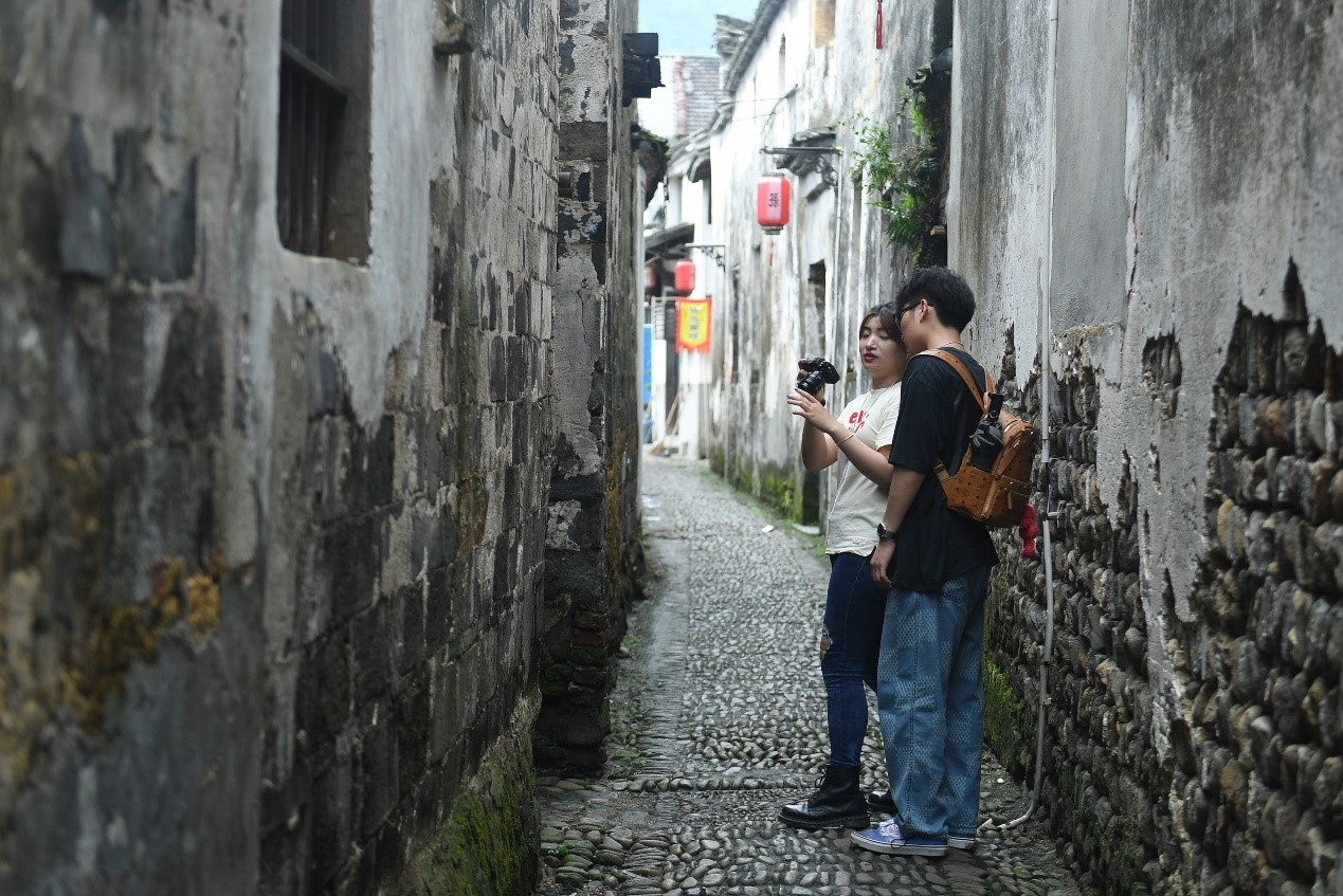图为两位台湾青年在富阳龙门古镇的巷道中拍摄。