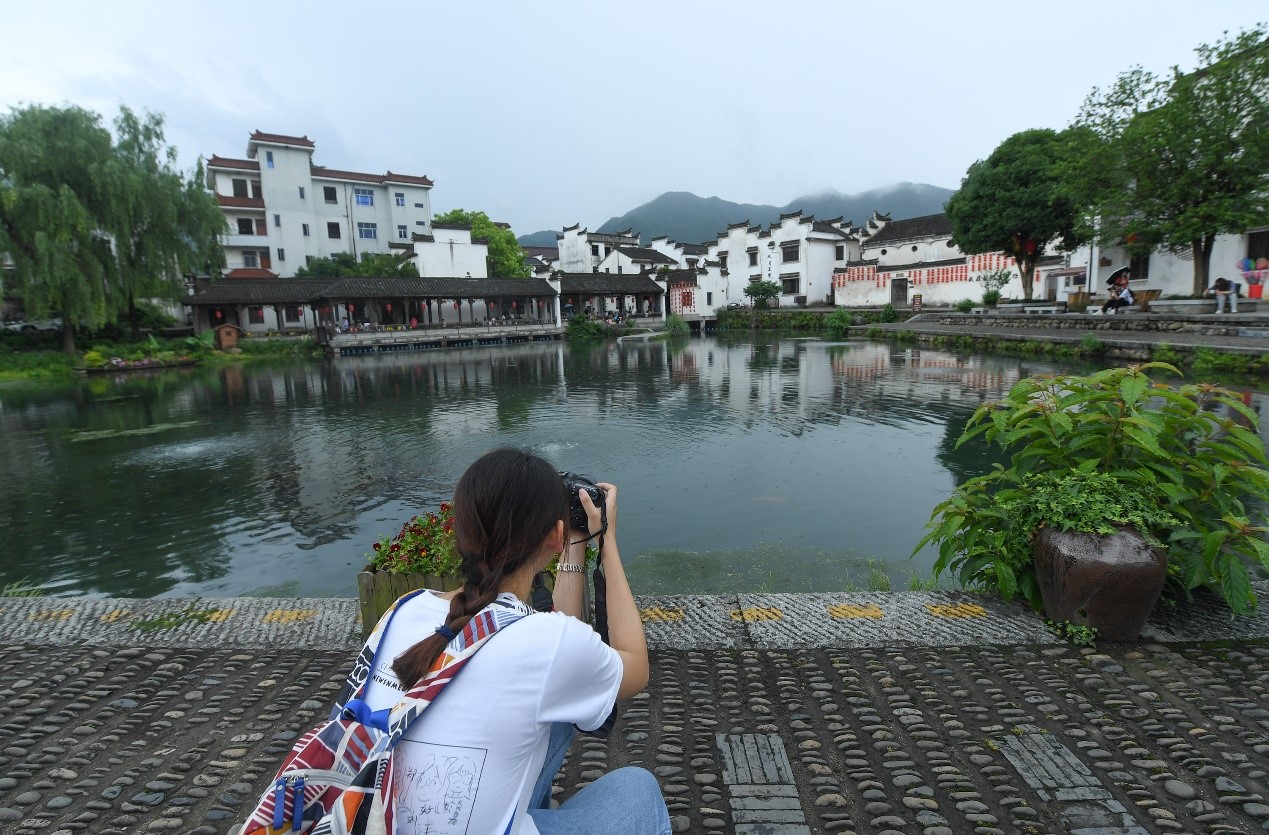 图为一位台湾青年在富阳龙门古镇拍摄乡村民居。