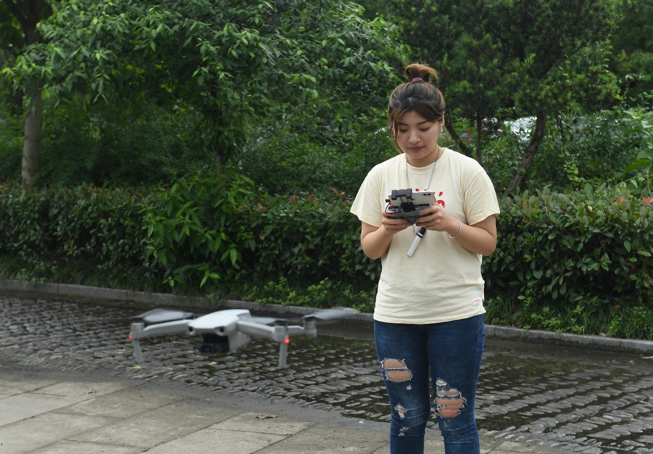 图为一位台湾青年在富阳龙门古镇使用无人机进行航拍。