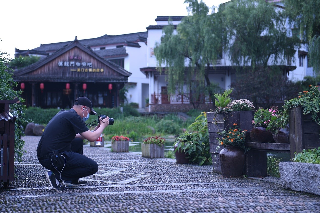 图为台湾青年在富阳龙门古镇拍摄创作。