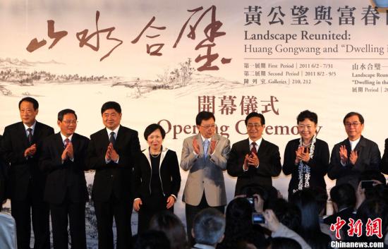 “山水合璧—黄公望与富春山居图特展”6月1日上午在台北故宫举行开幕仪式。浙江省委书记赵洪祝、国家文物局局长单霁翔、台湾中华文化总会会长刘兆玄、台北故宫博物院院长周功鑫等出席。中新社发 赵振清 摄