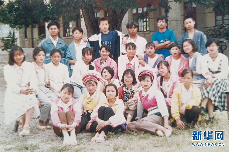 1995年,张桂梅在大理喜洲一中任教,和学生在一起合影(资料图)。新华网发(华坪县融媒体中心 供图)
