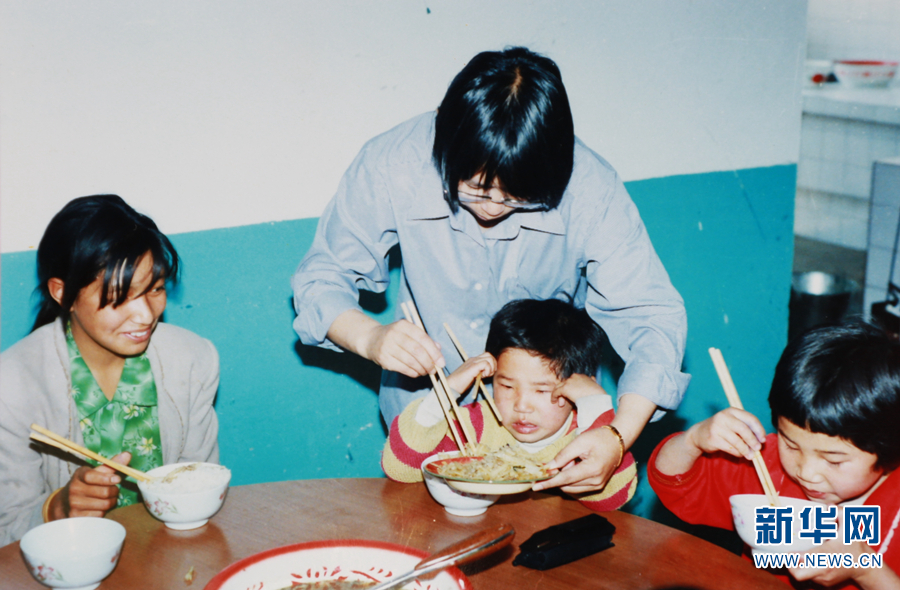 2002年,张桂梅在“儿童之家”照顾孩子们吃饭(资料图)。新华网发(华坪县融媒体中心 供图)