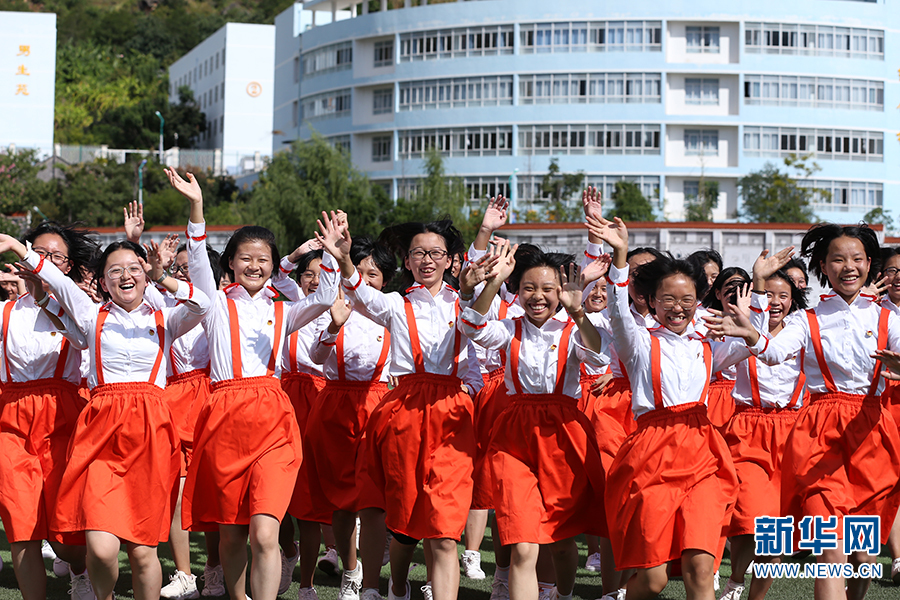 学生们面对镜头欢快地招手(2019年10月17日摄)。新华网 赵普凡 摄