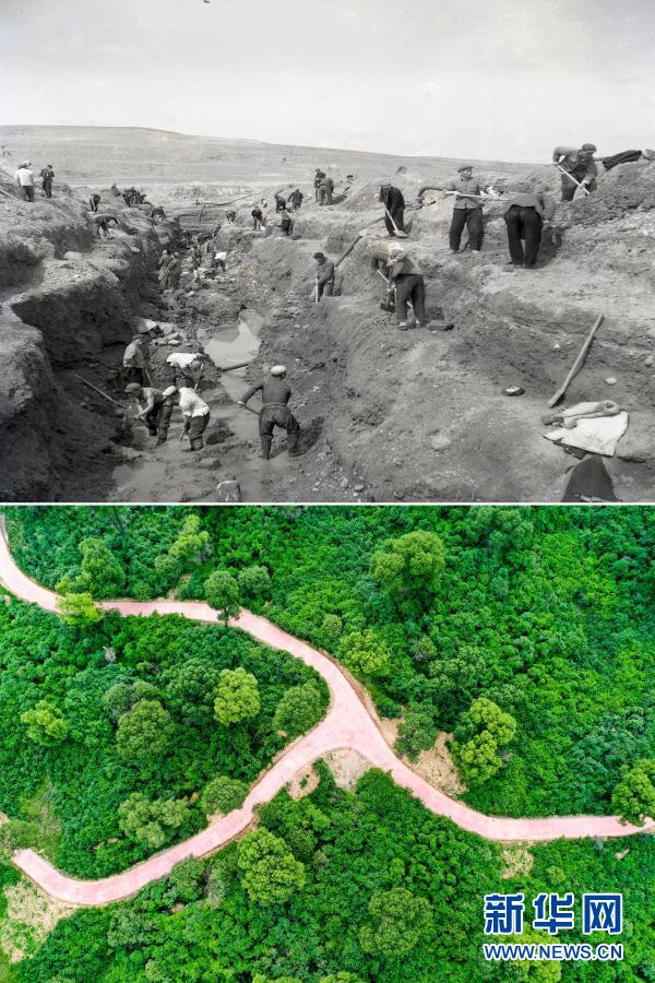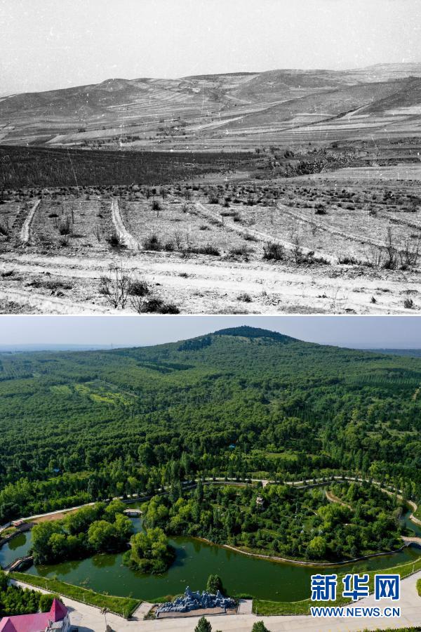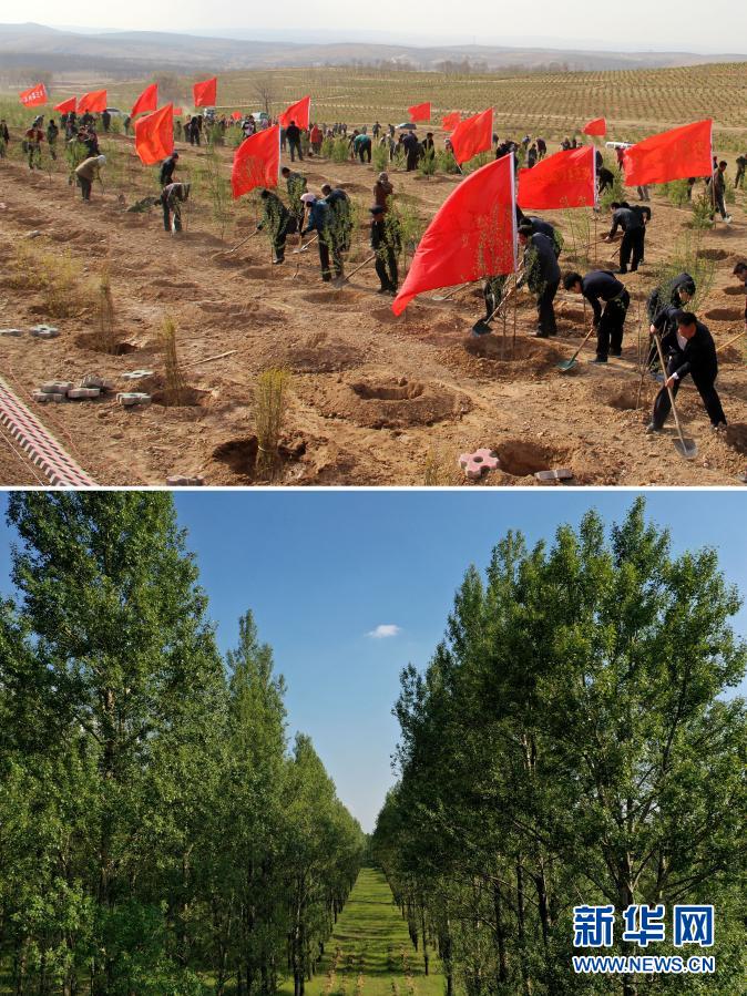 拼版照片:上图为山西省右玉县马营河村村民在植树造林(资料照片);下图为朔州市右玉县马营河村附近的人工林(2020年7月21日新华社记者曹阳摄)。新华社发