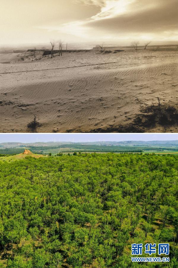 拼版照片:上图为治理前,山西省右玉县随处可见的荒凉沙地(资料照片);下图为生机盎然的山西省右玉县小南山森林公园(2020年7月21日新华社记者曹阳摄,无人机照片)。新华社发
