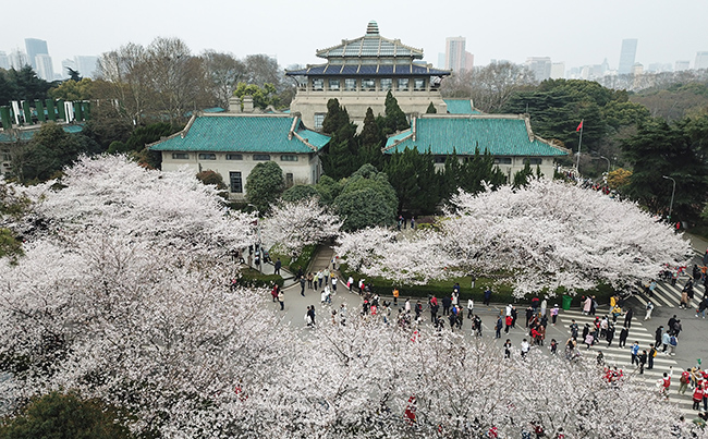 3月13日,来自各地的援鄂医护人员在武汉大学校园共赴樱花之约(无人机照片)。