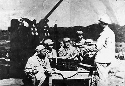 抗美援朝战场上,“十颗红星炮班”(左二为樊树甲)在战斗间隙研究战法。