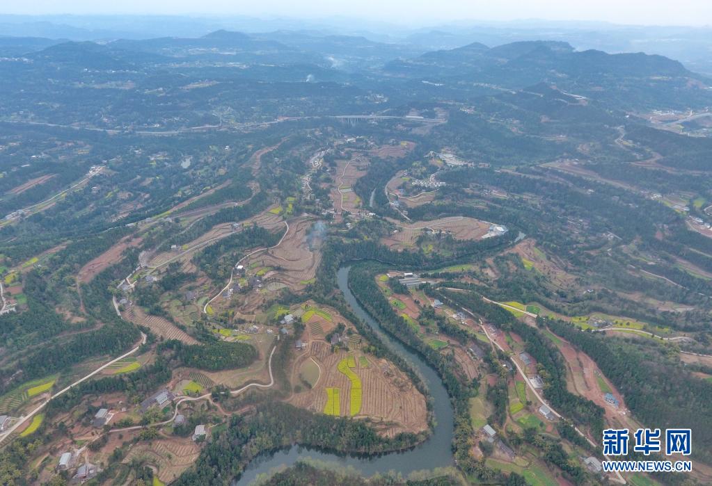 3月2日拍摄的巴中市秦巴山区风光,这里随处可见连片的产业基地(无人机照片)。新华社记者 刘坤 摄
