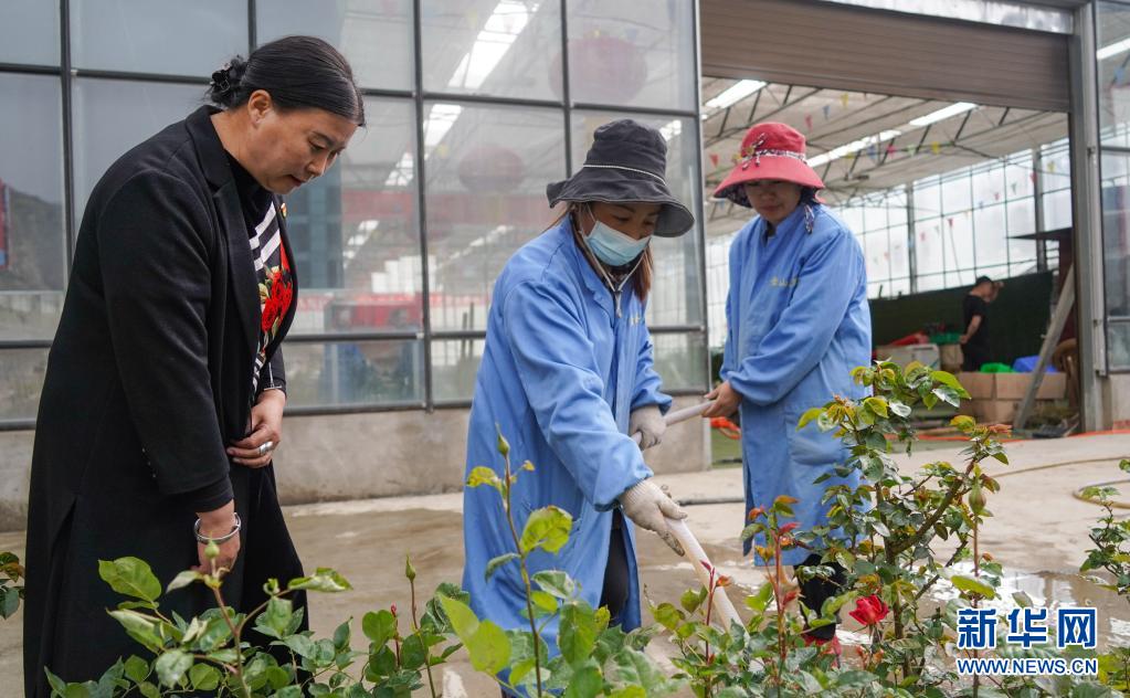 在金山玫瑰产业基地,陈望慧(左)在指导工人给玫瑰花浇水(4月14日摄)。新华社记者 王曦 摄