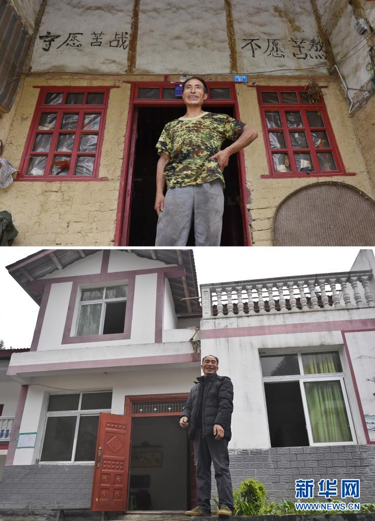 拼版照片:上图是2016年8月22日,李国芝在老房门前留影,墙上有他写的“宁愿苦战 不愿苦熬”八个大字;下图是2020年4月2日,李国芝在他现在居住的新房前留影。新华社记者 刘坤 摄