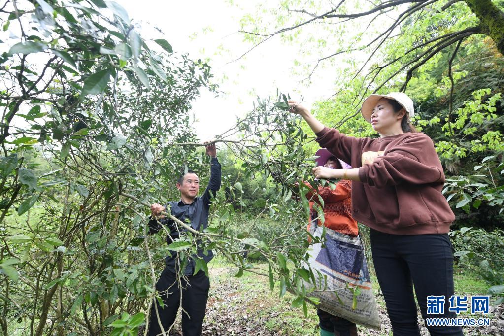 阿铁(左)和他的爱人吴冒花(右)在深山里采摘荒野茶(4月1日摄)。新华社记者 林善传 摄