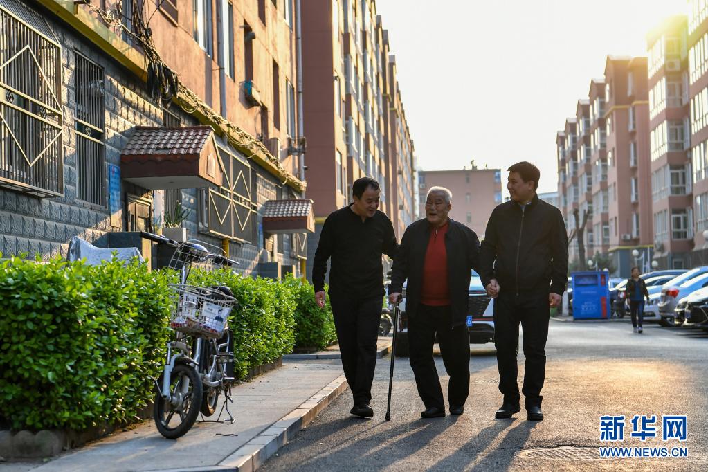 张良贵(中)、张海(左)、张世奇在散步(4月22日摄)。