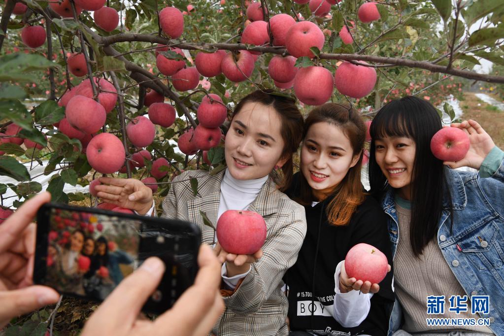 2019年10月22日,游客在陕西省延安市志丹县双河镇李家湾村果园拍照留影。新华社记者 陶明 摄