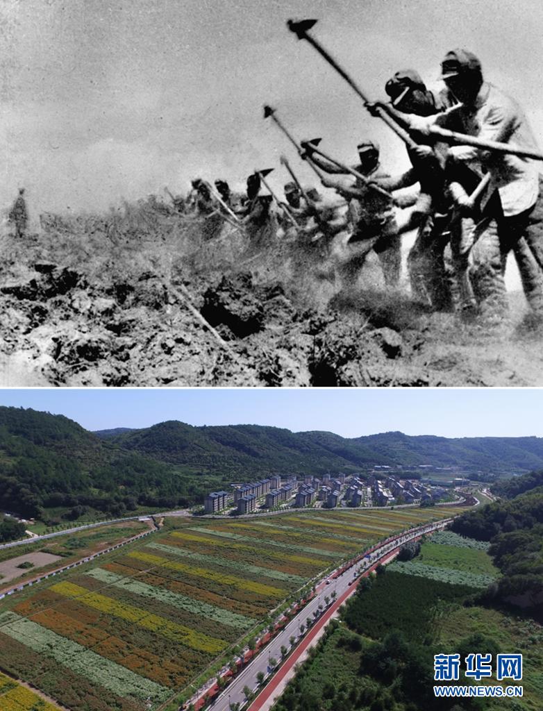 这是一张拼版照片,上图为:抗日战争期间,八路军三五九旅在南泥湾开荒生产(资料照片,新华社发);下图为:2020年8月25日拍摄的延安南泥湾景色(无人机照片,祁小军摄)。新华社发