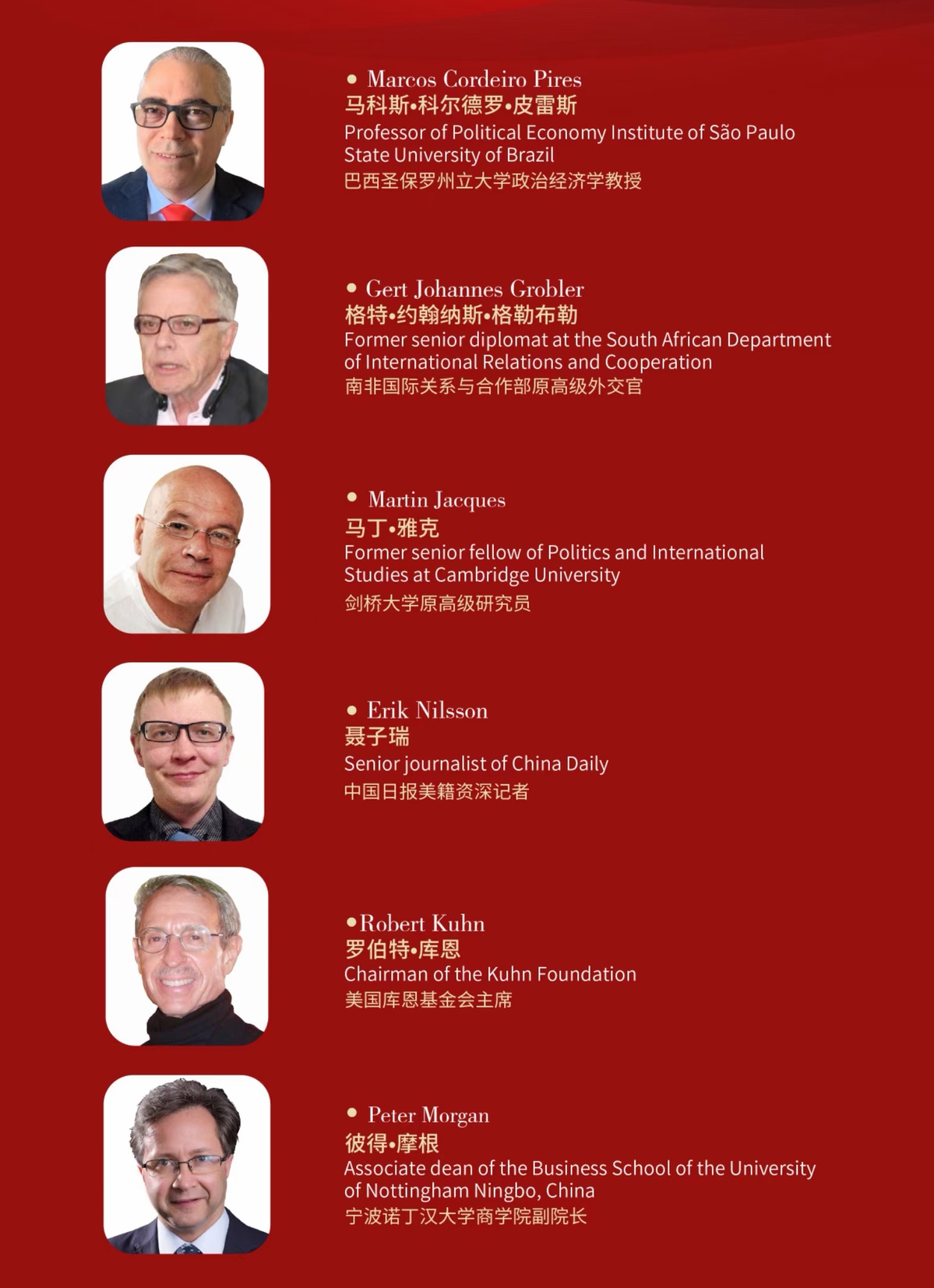 中共浙江省委常委、宣传部部长朱国贤,中国日报社总编辑周树春,中共嘉兴市委书记张兵发表致辞。巴西圣保罗州立大学政治经济学教授马科斯 皮雷斯(Marcos Pires)、南非国际关系与合作部原高级外交官格特 格勒布勒(Gert Grobler)、剑桥大学原高级研究员马丁 雅克(Martin Jacques)、美国库恩基金会主席罗伯特 库恩(Robert Kuhn)、中国日报美籍资深记者聂子瑞(Erik Nilsson)、宁波诺丁汉大学商学院副院长彼得 摩根(Peter Morgan)发表演讲,以全球化视角并结合自身经历,生动讲述了他们眼中的中国共产党。演讲嘉宾对中国共产党成立100周年表示热烈祝贺,对以习近平同志为核心的党中央带领中国人民取得的伟大成就表示钦佩,以生动的事例深入阐述了中国共产党为什么能、中国特色社会主义为什么好。