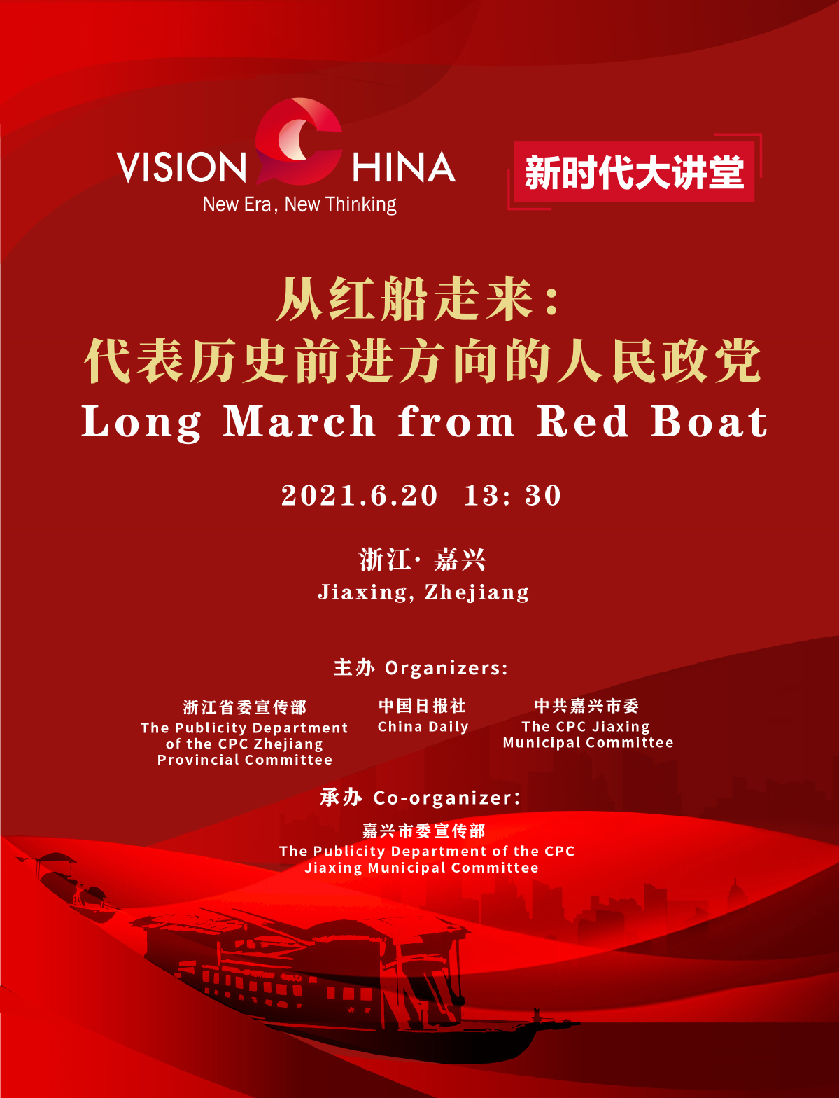 中国日报6月20日电 为迎接和庆祝中国共产党成立100周年,展示百年光辉历程,传播红船精神,对外讲好中国共产党的故事,中国日报社联合中共浙江省委宣传部和中共嘉兴市委于6月20日在嘉兴南湖,共同举办主题为“从红船走来:代表历史前进方向的人民政党”的“新时代大讲堂”。