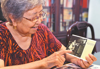 黄宝妹在上海的家中翻看自己做纺织女工时的老照片(六月十日摄)。