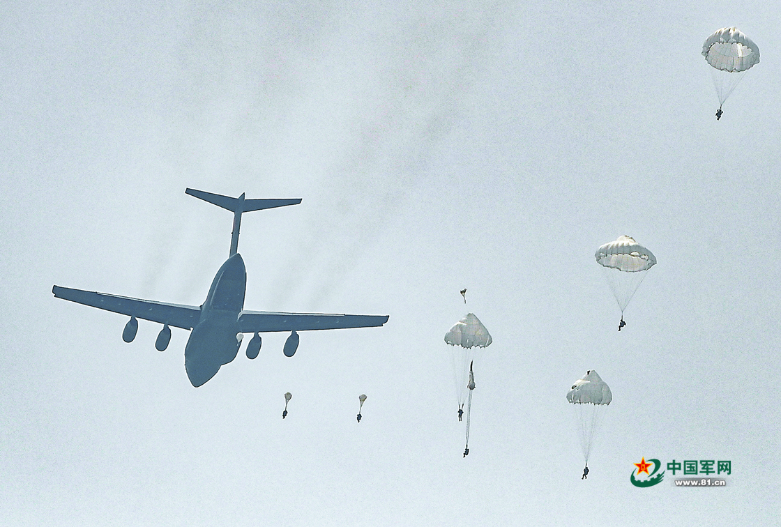 “跳!跳!跳!”离机信号响起,特战队员接连跃出机舱,朵朵伞花在空中竞相绽放。安全着陆后,他们迅即投入战斗行动之中。与此同时,担任蓝军的某合成旅三营在预定地点展开防御,一场激烈对抗随即上演。