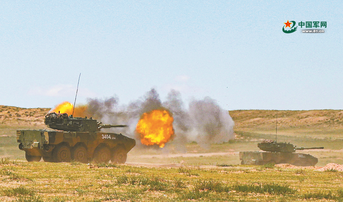 某型突击车在机动中对“敌”实施火力打击。