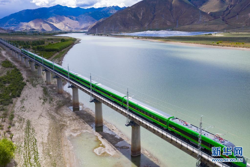 试运行的复兴号列车行驶在雅鲁藏布江上(6月16日摄,无人机照片)。新华社记者 普布扎西 摄