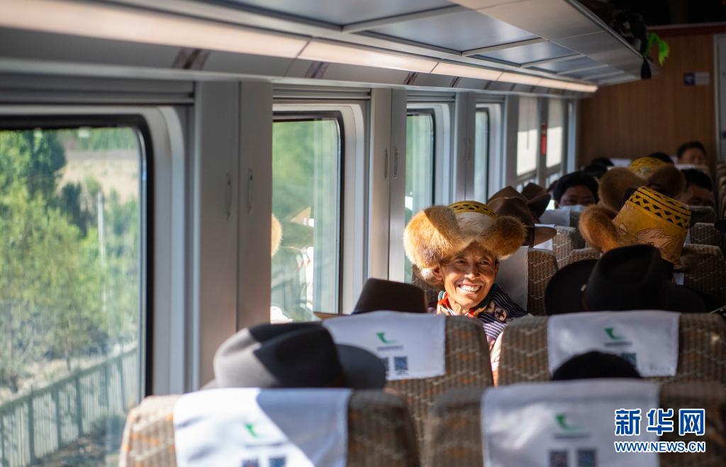 来自山南市贡嘎县杰德秀镇杰德秀村的巴珠,今年68岁,他一会儿从车窗眼望高山峡谷,一会儿摸摸车内现代化设施,这是他头一次坐火车。“复兴号和牛车比起来,像是在飞翔。”他笑着说。