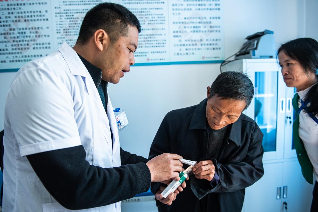医生在由澳门援建的从江县小翁村卫生室内给村民讲解用药须知(2019年11月15日摄)。新华社记者 陶亮 摄
