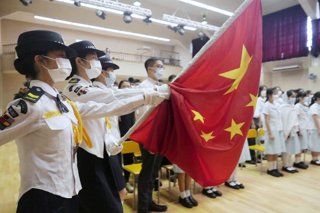 在香港教育工作者联会黄楚标中学,白衣蓝帽护旗升旗小队正步走向旗杆(2021年9月1日摄)。新华社记者 王申 摄